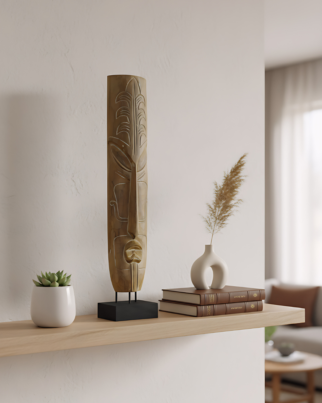 Bring a sense of ancient mystery and organic texture to your interior with the Aztec Totem. Standing an impressive 100 cm tall, this striking decorative piece is hand-carved from premium Suar wood, celebrated for its durability and beautiful interlocking grain. The Aztec features a slender, elongated profile with intricate linear engravings that evoke tribal symbolism. Finished in a soft natural wash, the light tones highlight the hand-chiseled textures of the wood, making it a perfect statement piece for coastal, bohemian, or contemporary minimalist spaces