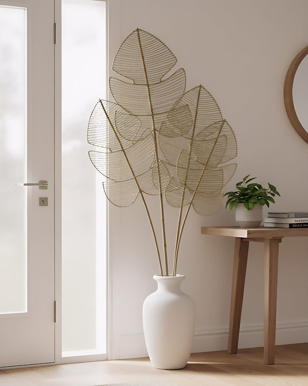 Introducing the Coastal Canopy a stunning decorative piece that effortlessly enhances your living space. Measuring 45 x 2 x 200 cm, this elegant arrangement features metal leaves delicately perched on natural bamboo and rattan sticks, creating a harmonious blend of modern and bohemian aesthetics. The natural color adds warmth and sophistication, making it a versatile addition to any decor style. Elevate your home with this unique piece that not only serves as a striking visual element but also brings a touch of nature indoors. Perfect for those looking to add a stylish focal point to their interior design.
