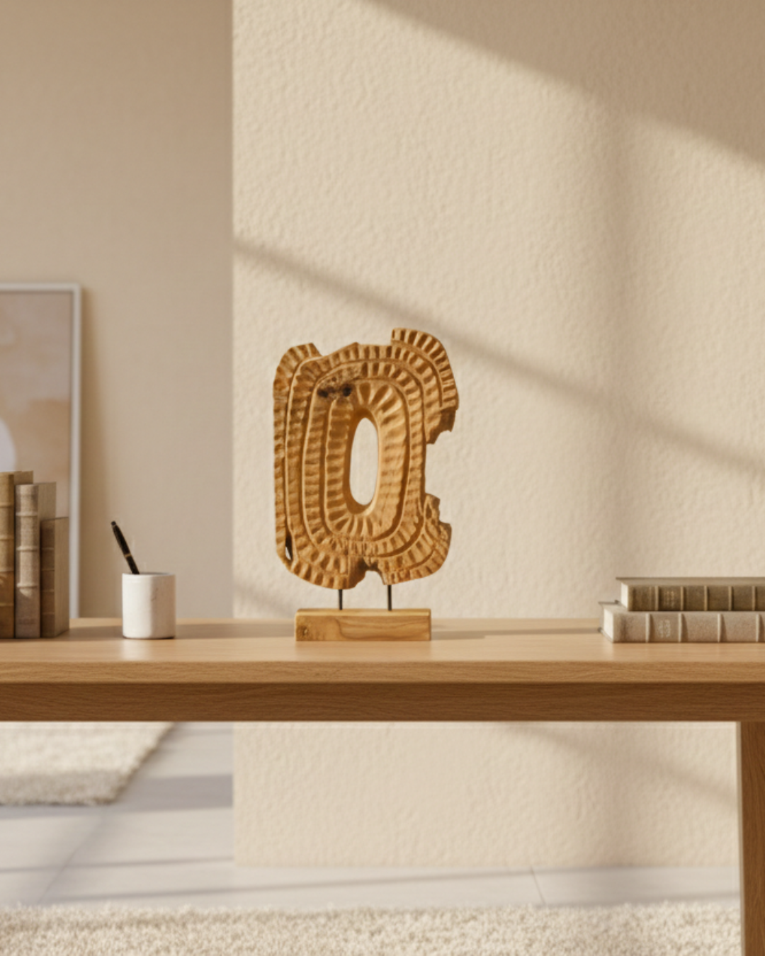 The Eldora is a captivating sculptural statement handcrafted from premium teak wood in a warm natural finish, featuring a rugged, organic silhouette with hand-carved concentric textures and intentional raw edges. Measuring 38 x 10 x 58 (H) cm, this artistic piece showcases a hollow-core design that celebrates the wood's authentic imperfections and grain. Mounted on a minimalist dual-rod metal stand and a solid matching wood base, it serves as a sophisticated focal point for modern, rustic, or bohemian-inspired interiors.