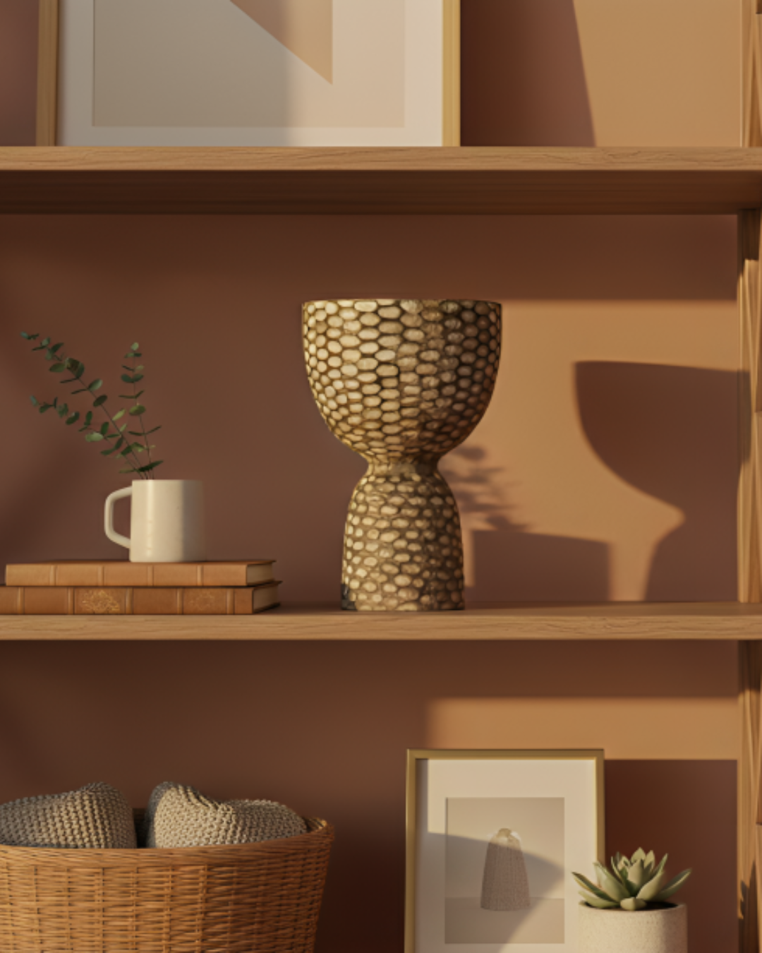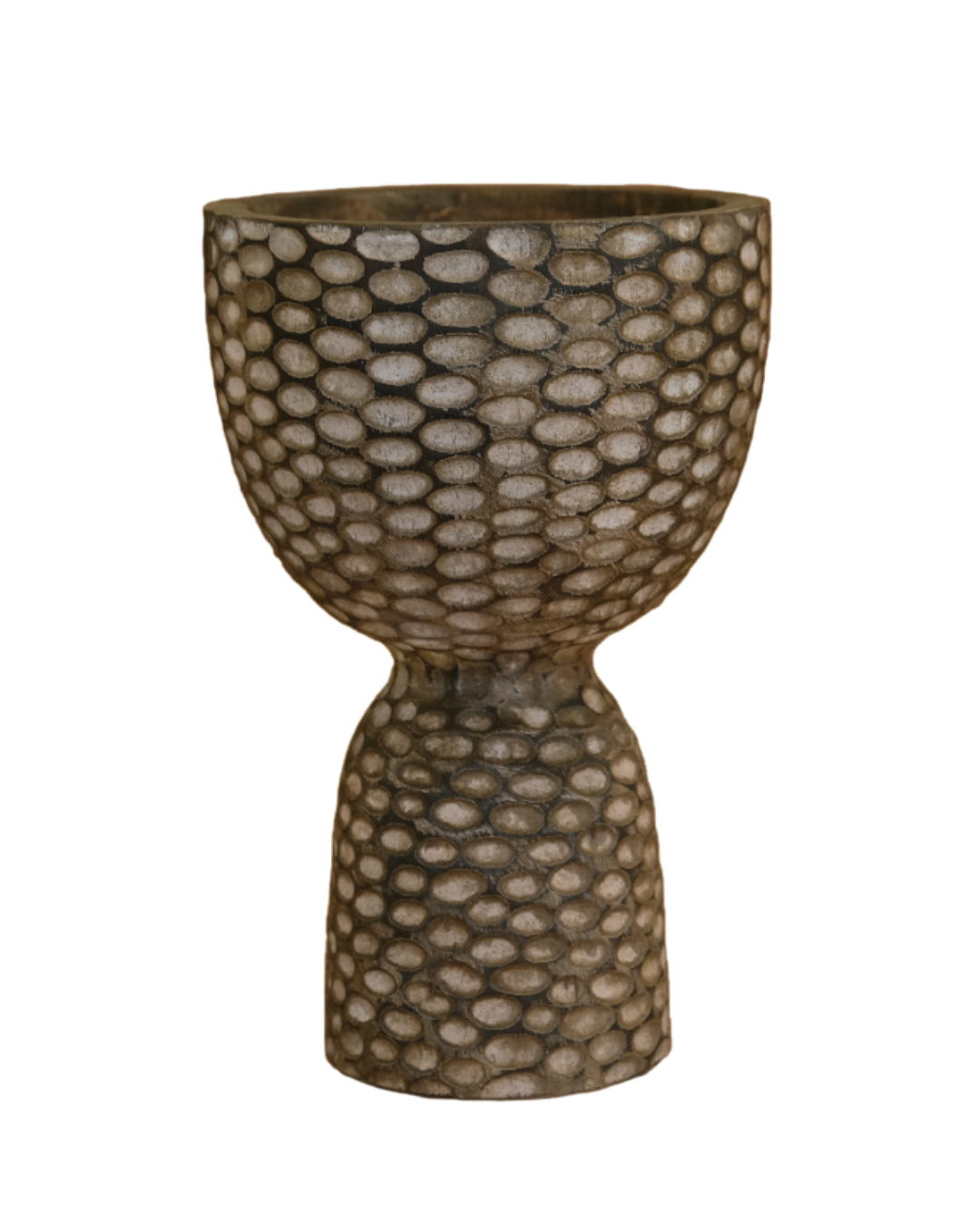 The Kai is a striking statement piece handcrafted from premium suar wood and finished in a deep, washed brown that highlights its unique honeycomb-textured surface. Measuring 20 cm in diameter and 30 cm (H), this vessel features a bold, goblet-inspired silhouette with a hand-carved, dimpled pattern that creates a captivating play of light and shadow. Its earthy, organic aesthetic makes it an ideal centerpiece for any modern or rustic interior, seamlessly blending artisanal craftsmanship with a contemporary sculptural form.