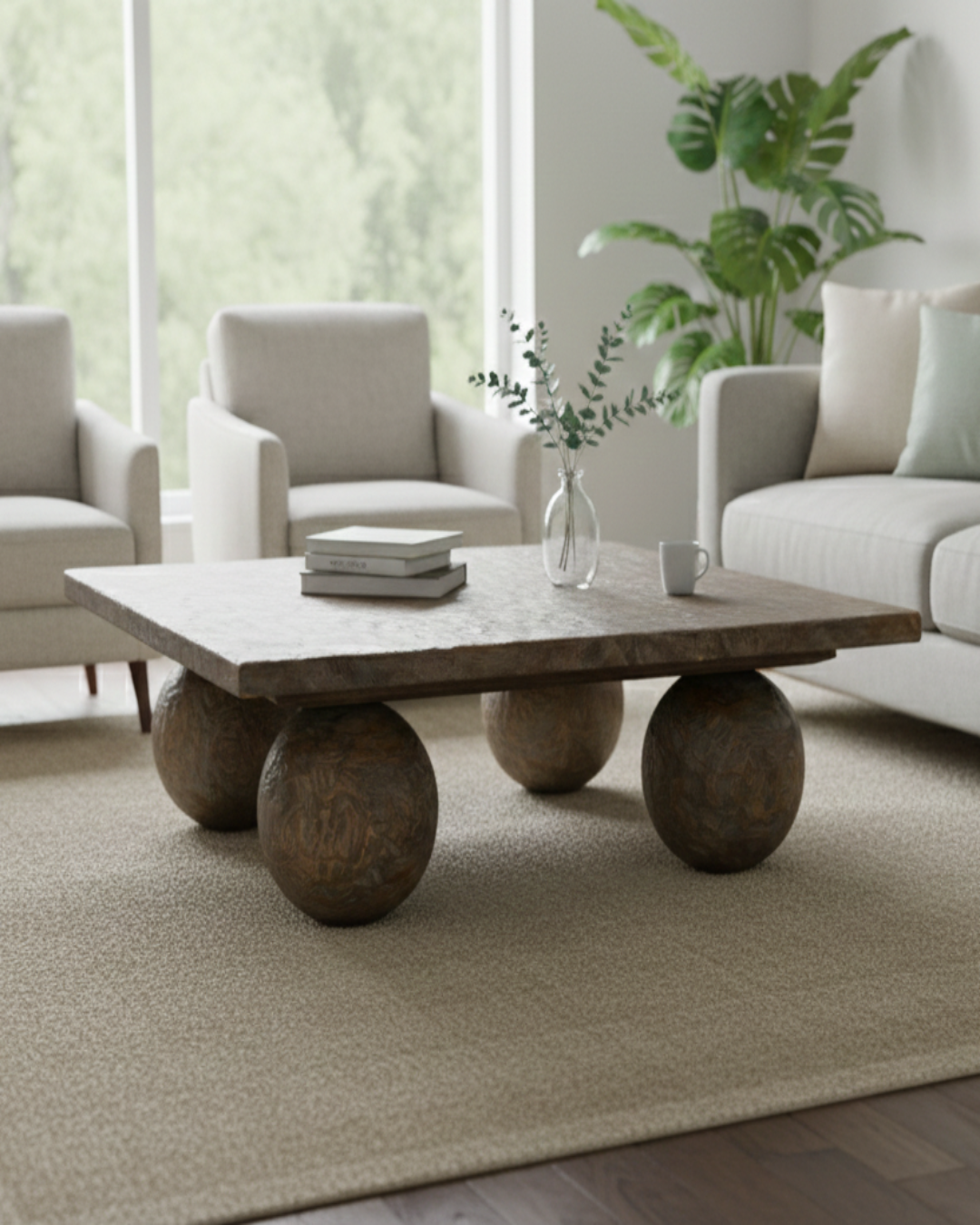 The Noel is a low-profile, artisanal coffee table handcrafted from premium teak wood with a rich antique brown finish that highlights the timber's natural depth and texture. Measuring 80 x 80 x 27 (H) cm, this statement piece features a thick, square tabletop with a unique hand-chiseled surface, supported by four substantial spherical legs that provide a bold, geometric silhouette. Its blend of rustic craftsmanship and modern primitive design makes it a sophisticated focal point for contemporary living spaces seeking a touch of organic warmth.