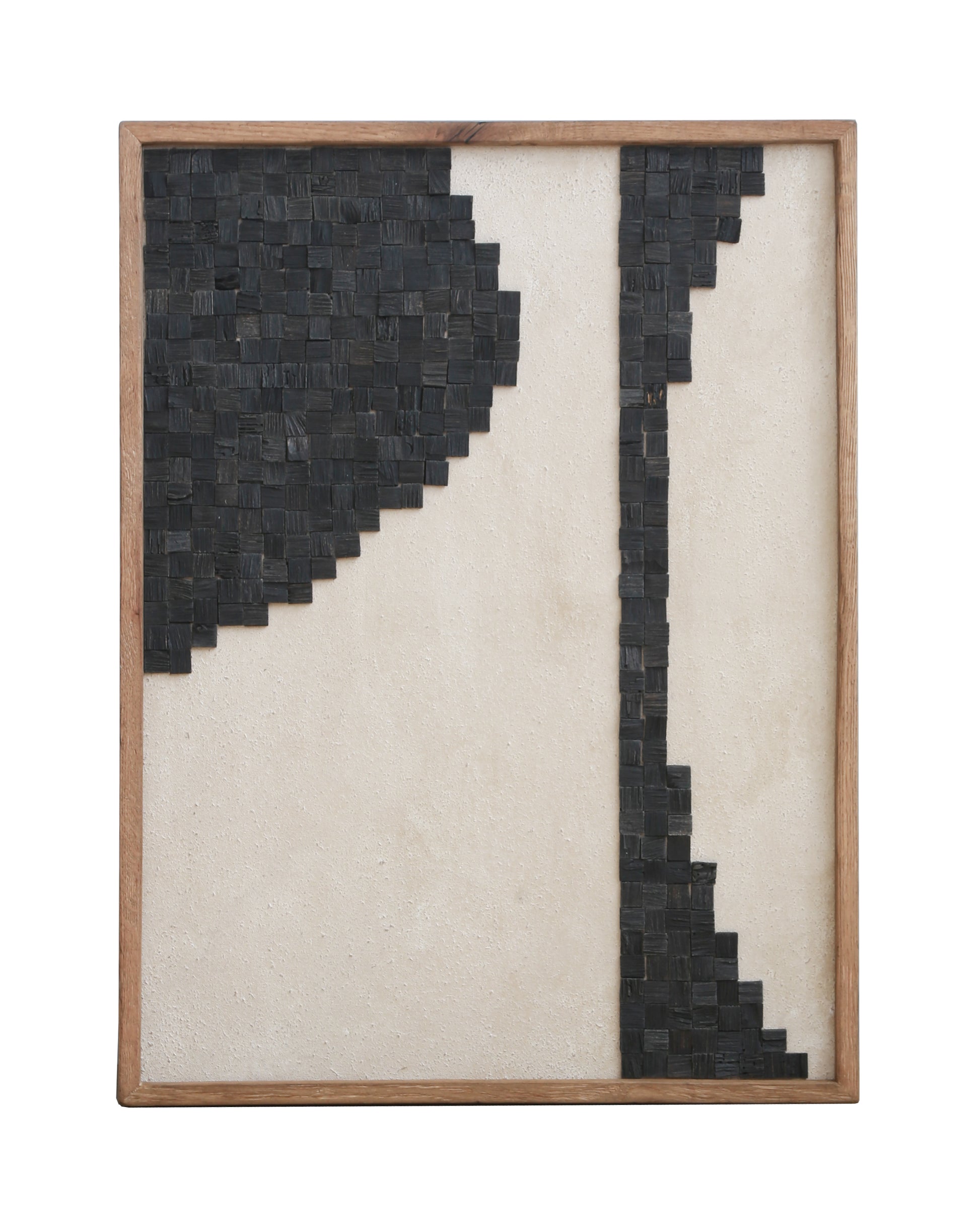 Elevate your home decor with the Obsidian Tessellation I, a stunning black and white square wall hanging that seamlessly blends modern aesthetics with timeless elegance. Crafted from recycled oak, this piece not only showcases a unique geometric design but also reflects a commitment to sustainability. Measuring 62 cm by 82 cm, it is perfectly sized to make a statement in any room while the natural wooden frame adds warmth and character. Transform your space with this exquisite artwork that is sure to captivate and inspire.