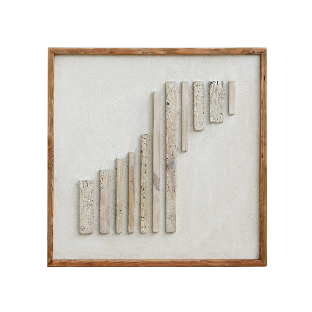 RHYTHM BAR is a stunning piece of art that seamlessly blends modern aesthetics with natural elements. Measuring 62x4x62, this captivating canvas features a unique combination of mixed media, showcasing a harmonious interplay of wooden sticks against a pristine white wall. The wooden frame adds a touch of warmth and sophistication, making it an ideal centerpiece for any room. Elevate your space with this exquisite artwork that not only enhances your decor but also inspires creativity and tranquility. Perfect for art enthusiasts and those looking to make a statement in their home or office.